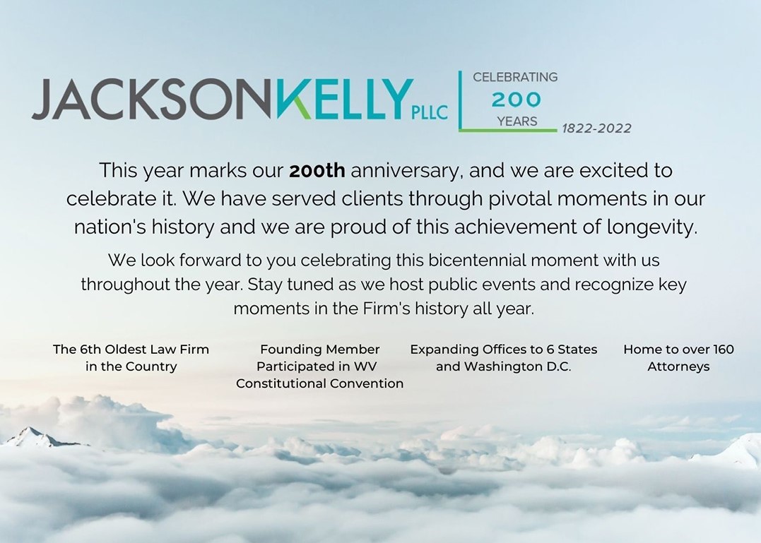 2022 Marks the 200th anniversary as a law firm for Jackson Kelly. We are excited to celebrate this bicentennial moment by looking back on our amazing history and moving forward for the next 200. This page will feature stories, pictures, blogs and more over our 200 years. It will be updated throughout the year so please keep checking back as we add new content each week. Thanks for celebrating our history with us!