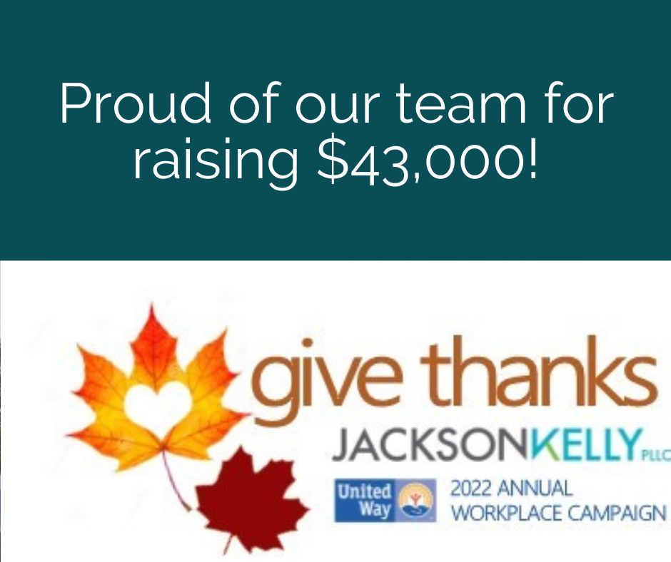 The Jackson Kelly Charleston Workplace Campaign for the UNITED WAY OF CENTRAL WEST VIRGINIA raised an impressive $43,000! This money will help fund nearly 50 programs in Kanawha, Putnam, Logan, Boone and Clay Counties, and will positively impact literally thousands of individuals in our local communities. December 21, 2021 |