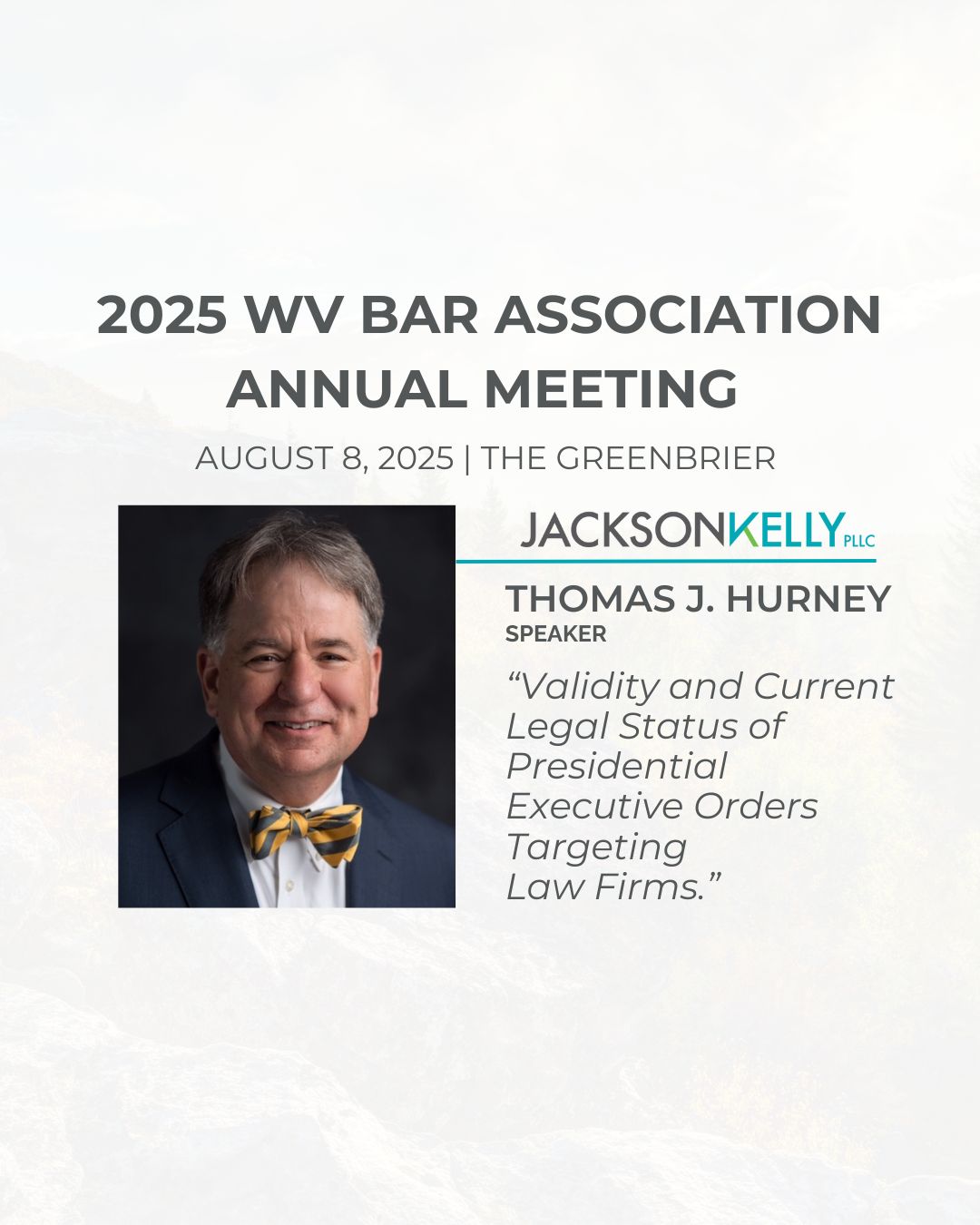 On August 8, Jackson Kelly attorney Thomas J. Hurney, Jr. will speak at the 2025 WV Bar Association Annual Meeting at The Greenbrier on “Validity and Current Legal Status of Presidential Executive Orders Targeting Law Firms.”
