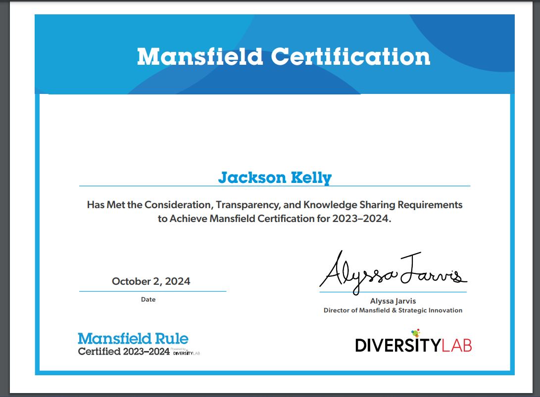 Jackson Kelly has experienced positive progress at our firm since we joined Mansfield, and we remain committed to taking measurable actions to ensure that our processes are — and remain — inclusive.