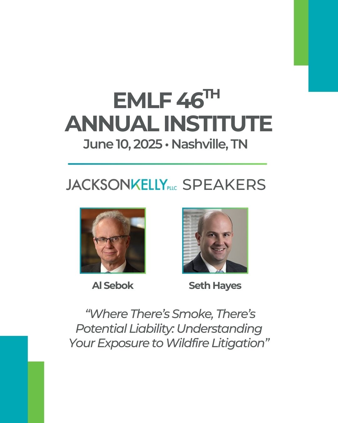 Jackson Kelly attorneys Al Sebok and Seth Hays will present, “Where There’s Smoke, There’s Potential Liability: Understanding Your Exposure to Wildfire Litigation.” We are honored to be a sponsor of this event and look forward to connecting with industry leaders in Nashville.