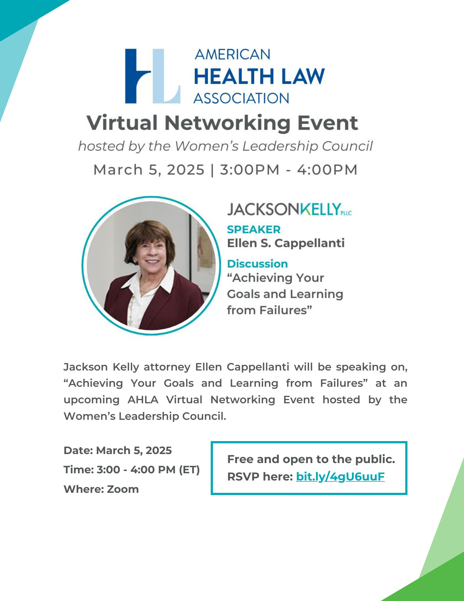 Jackson Kelly attorney Ellen Cappellanti will be speaking on, “Achieving Your Goals and Learning from Failures” at an upcoming AHLA Virtual Networking Event hosted by the Women’s Leadership Council.