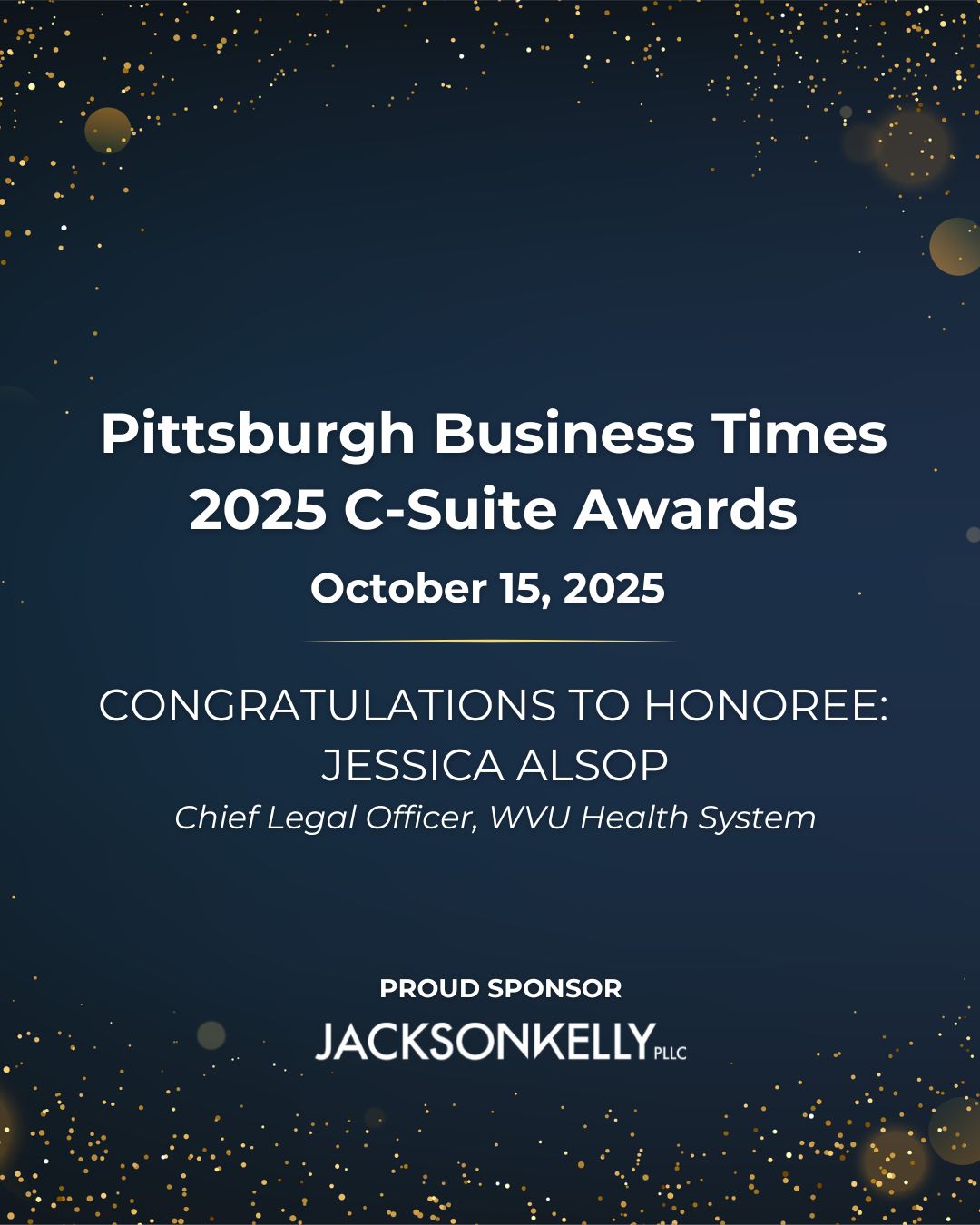 Jackson Kelly is proud to be an event sponsor and will have several attorneys in attendance showing support for honoree Jessica Alsop, Chief Legal Officer, WVU Health System.