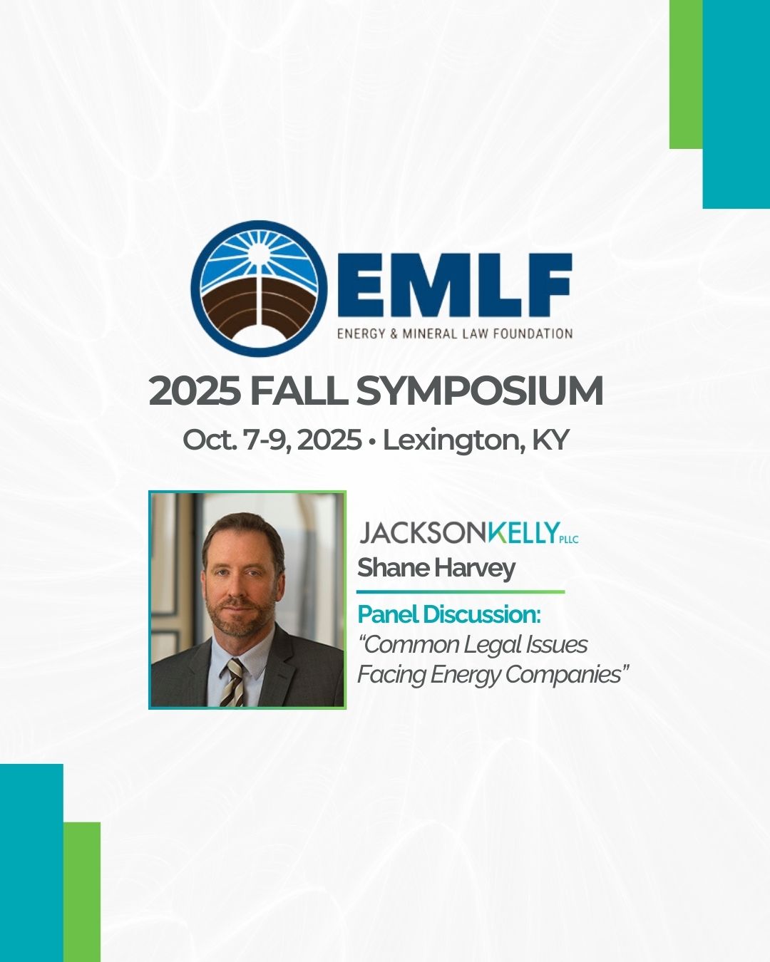 Jackson Kelly attorney Shane Harvey joins panel to discuss "Common Legal Issues Facing Energy Companies" at the 2025 EMLF Fall Symposium in Lexington, KY.