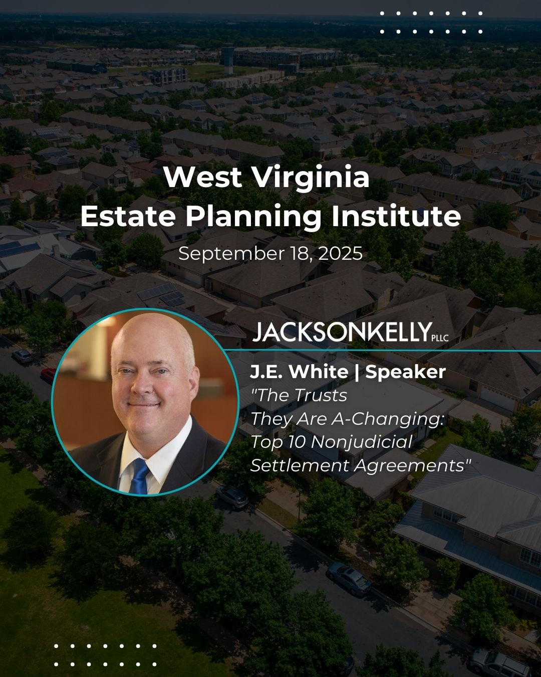 Jackson Kelly attorney J.E. White will present “The Trusts They Are A-Changing: Top 10 Nonjudicial Settlement Agreements” at the WV Estate Planning Institute. We’re proud to sponsor this event and support discussions shaping the future of trusts and estates law.